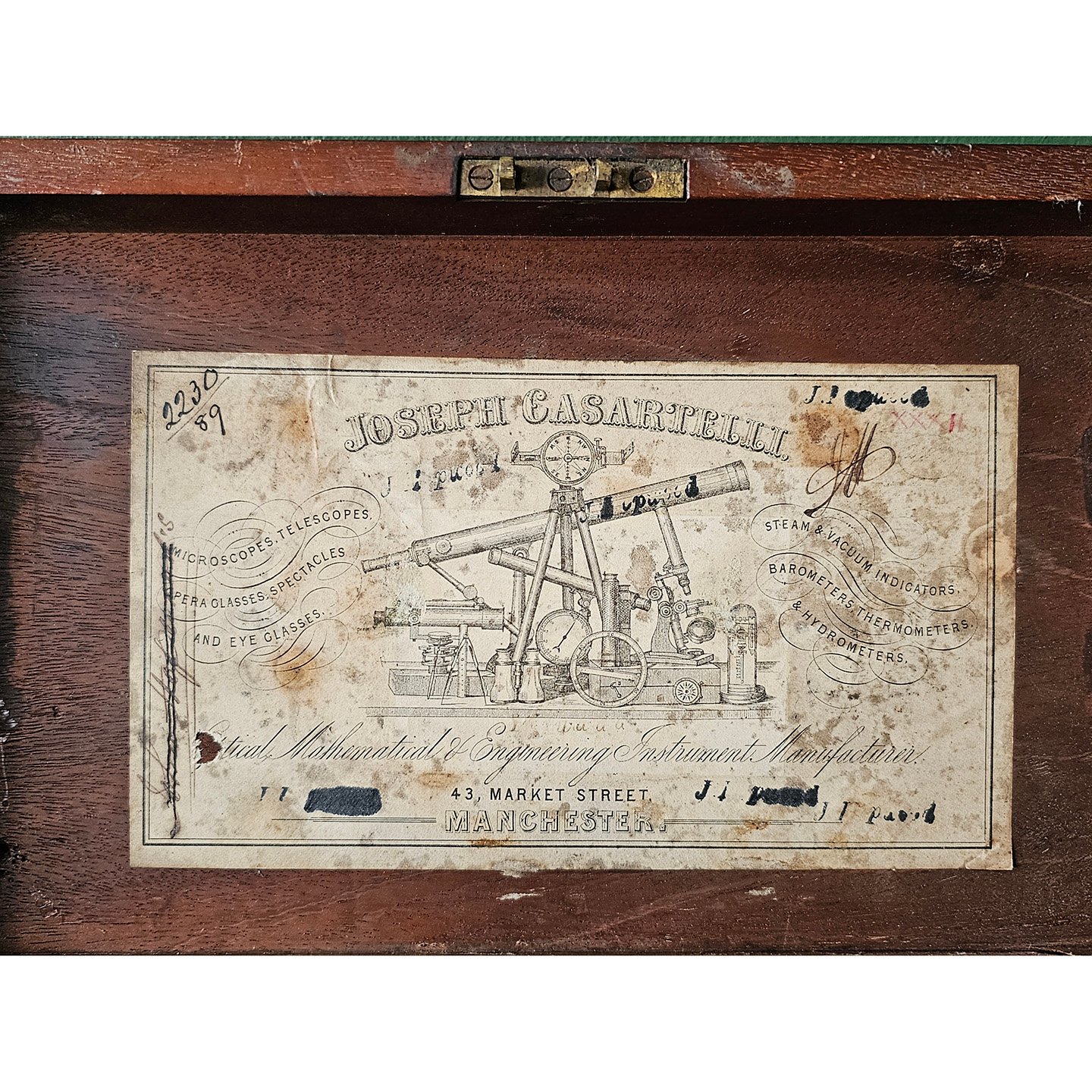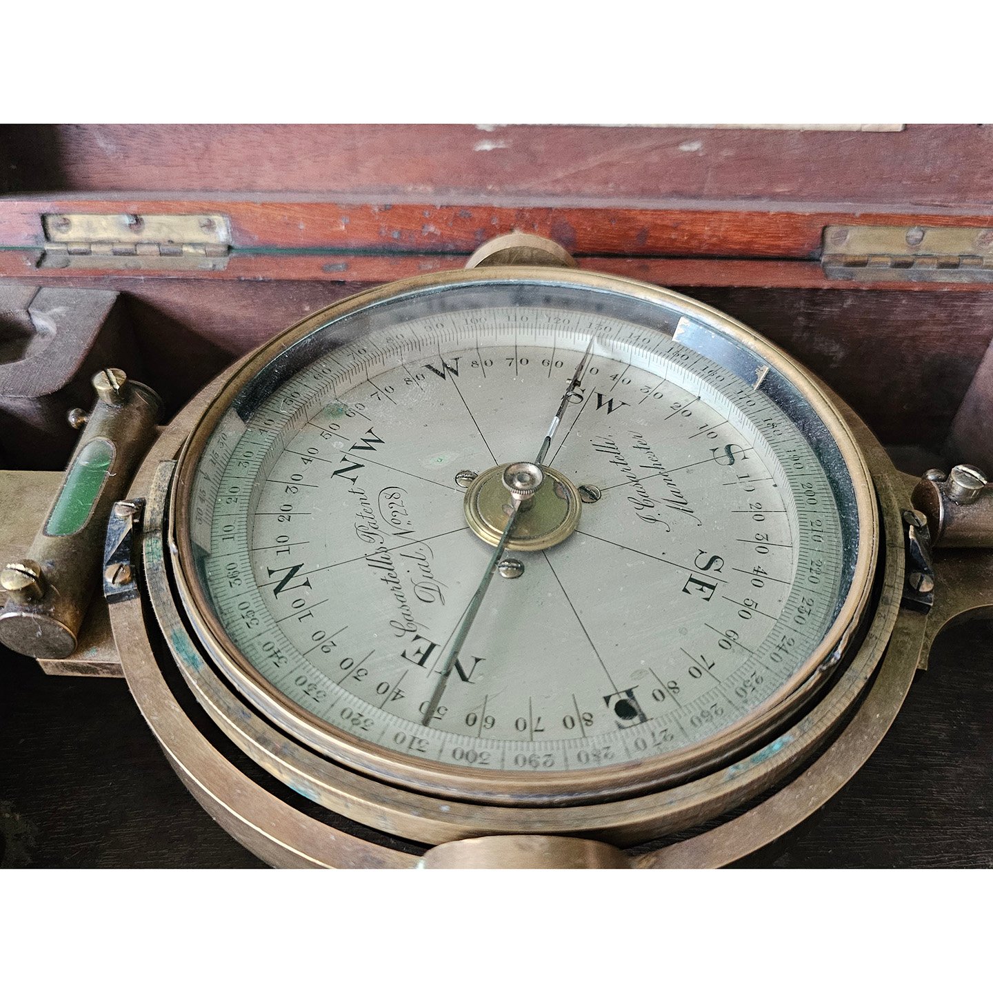 Antique 'Joseph Casartelli' Gimballed Brass Miners Compass in original fitted mahogany case with original paper label.