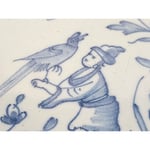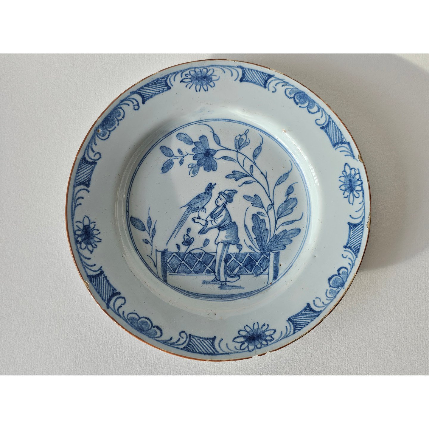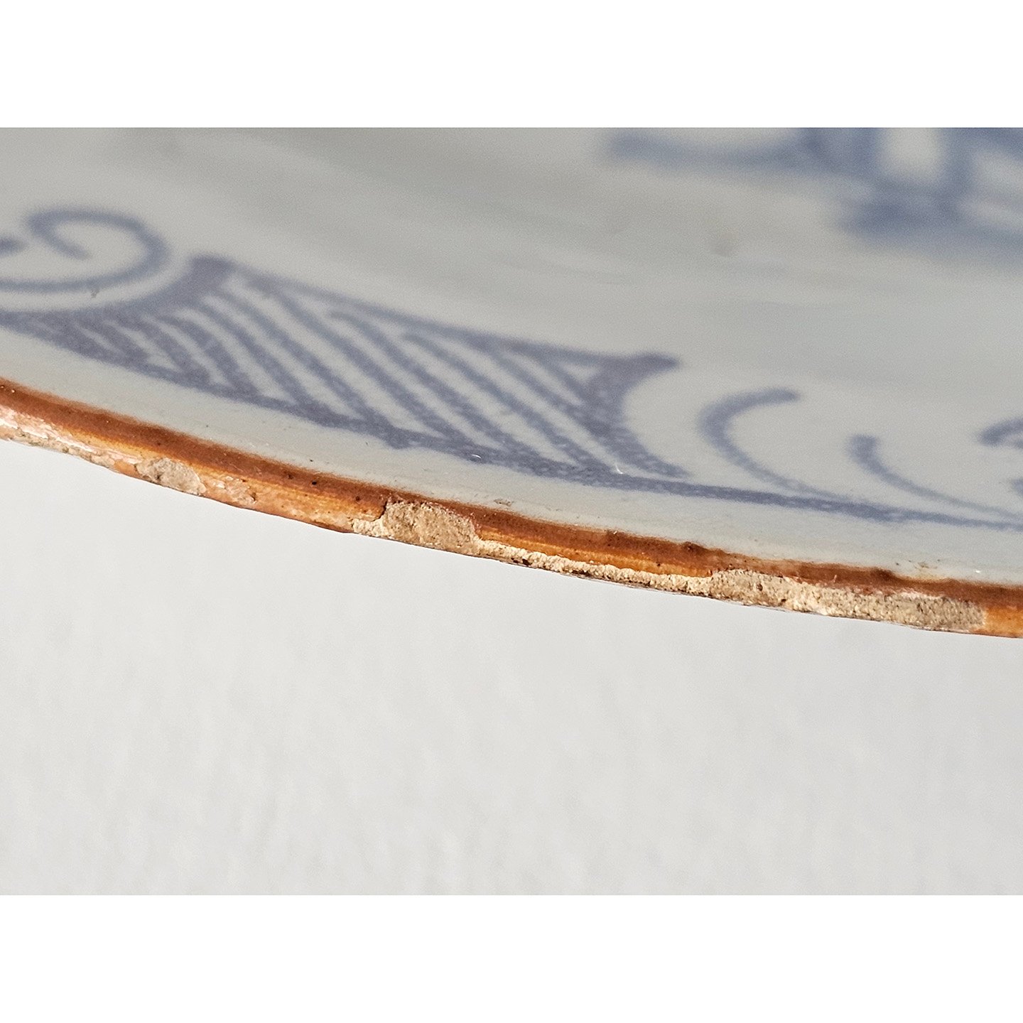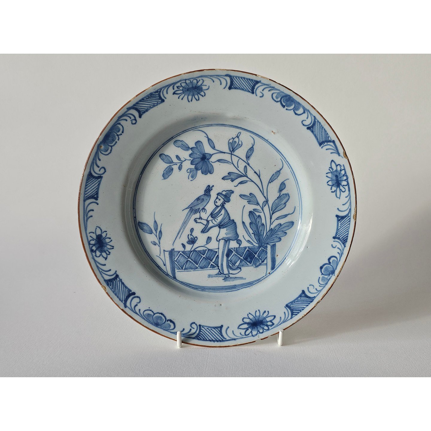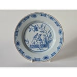 Antique tin-glazed earthenware plate featuring a 'Chinoiserie' blue & white painted image.